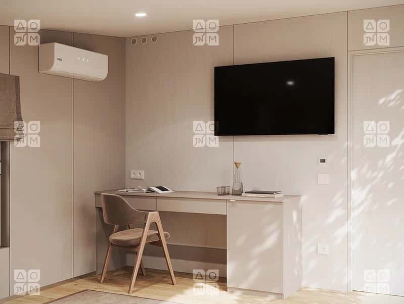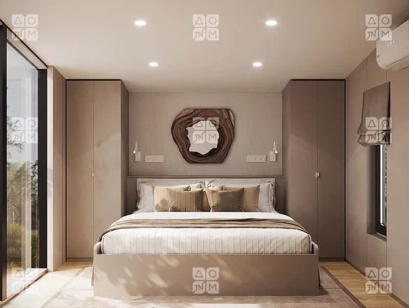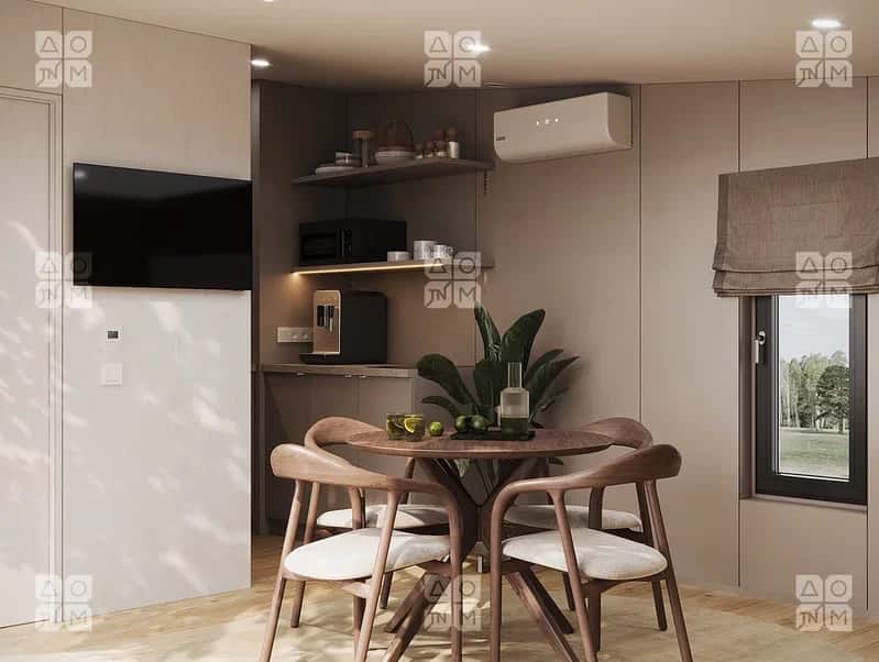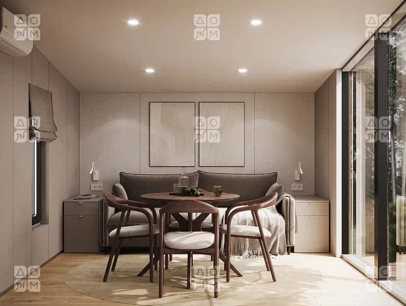 Одноэтажный дом, спальное место для комфортного времяпровождения в ночное время отделено шкафом.